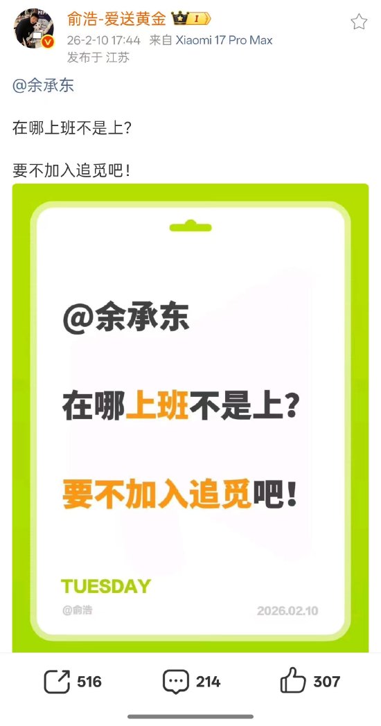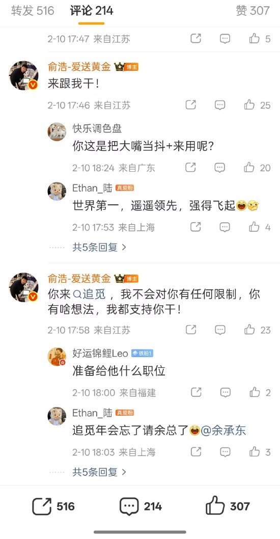 新浪科技讯 2月10日晚间讯息,本日,追觅科技首创东谈主在其个东谈主微博发文@华为常务董事、产物投资评审委员会主任、末端BG董事长,俞浩默示“在哪上班不是上?要不加入追觅吧!”