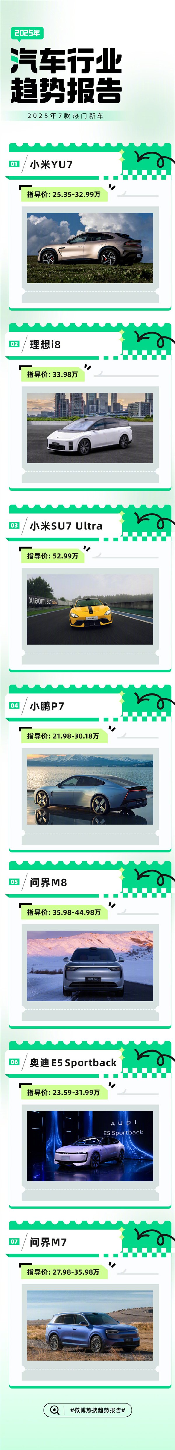 此外,微博热搜还发布2025年十大热搜汽车事件榜单,其中七款新车凭借高的公众轻柔度脱颖而出,分辨为:小米YU7、理念念i8、小米SU7 Ultra、小鹏P7、问界M8、奥迪 E5 Sportback以及问界M7。