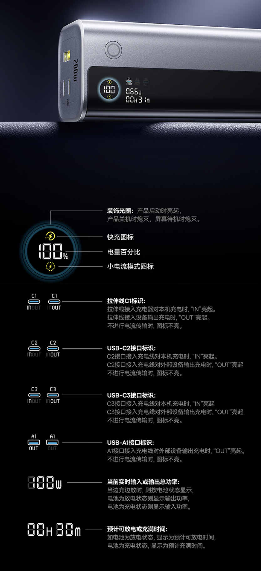 该转移电源举座给与银色配色,带有 LED 数显屏,澳门新浦京游戏下载提供 1 根伸缩式 USB-C 线及 1 根别离式 USB-C 线,其中 USB-C 线和 USB-C 接口均营救 100W 输出,USB-A 接口营救 22.5W 输出,在双口格局下可杀青 100W + 100W 供电。