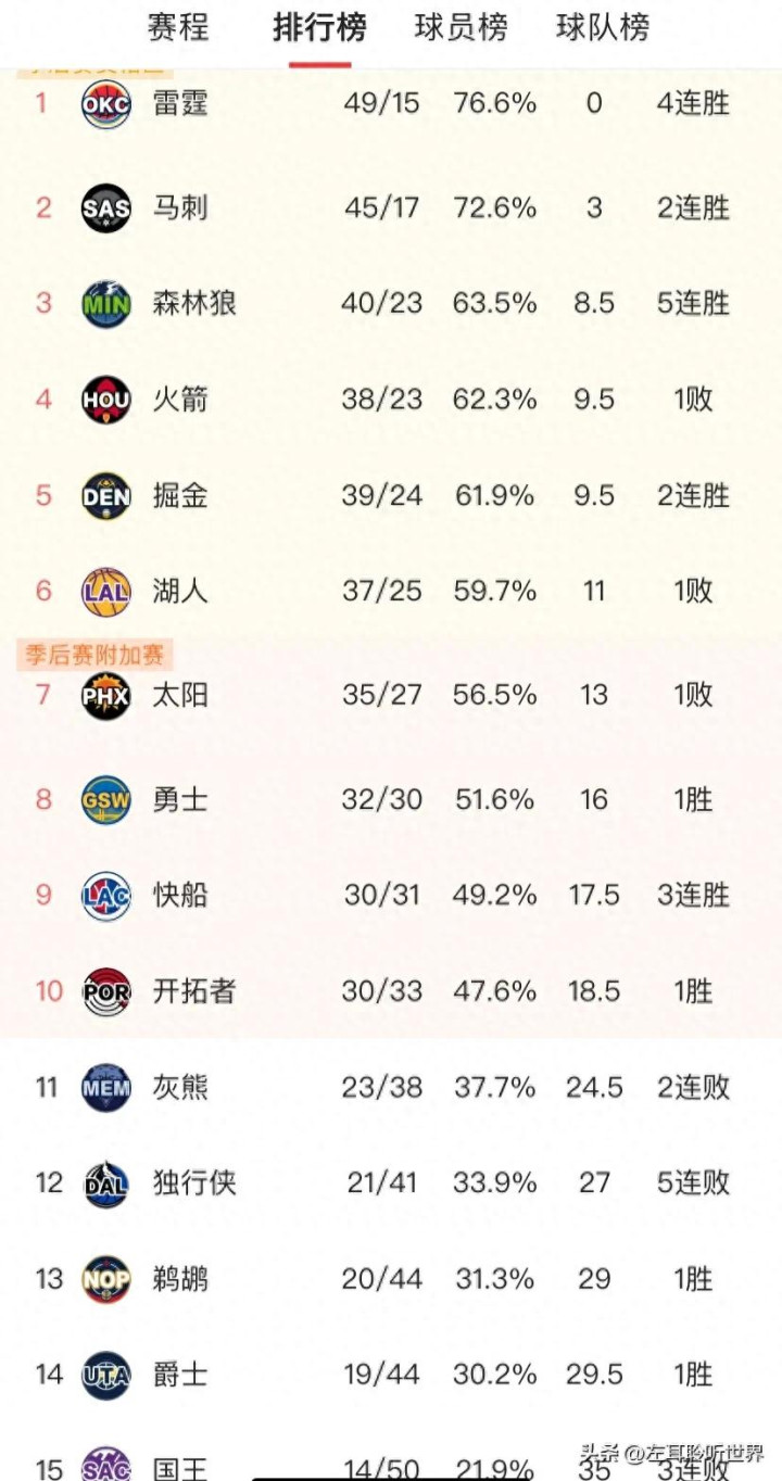 雷霆绝不夸张的说,即是西部的定海神针,球队战绩49胜15负,76.6%的胜率,岂论别家奈何折腾,榜首位置葫芦依样,妥妥躺赢到离谱。马刺45胜17负紧追后来,虽说差着3个胜场,但势头没断,还在憋着劲思往前冲一冲。